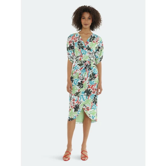 This is bonnie. A sweet wrap dress with tulip skirt and colorful leaf print!