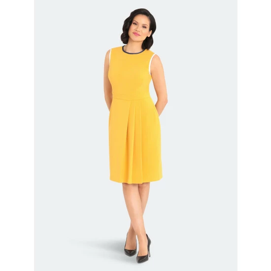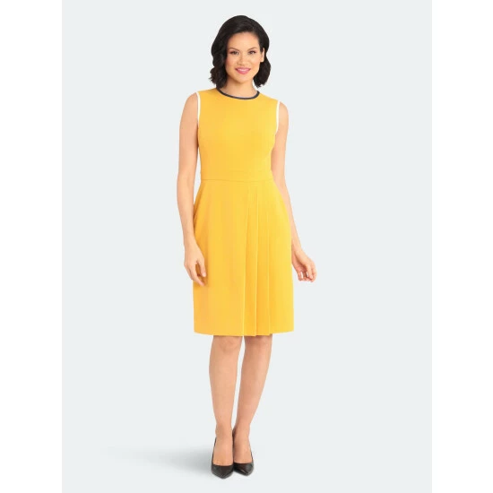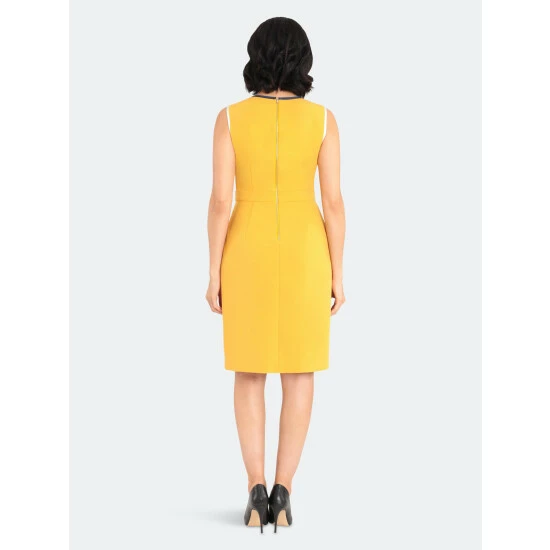 Introducing the Cassie dress. This golden design features side pleats and unique color-block binding. With the perfect amount of stretch, this classic sheath is perfect for your warm-weather occasions.