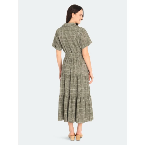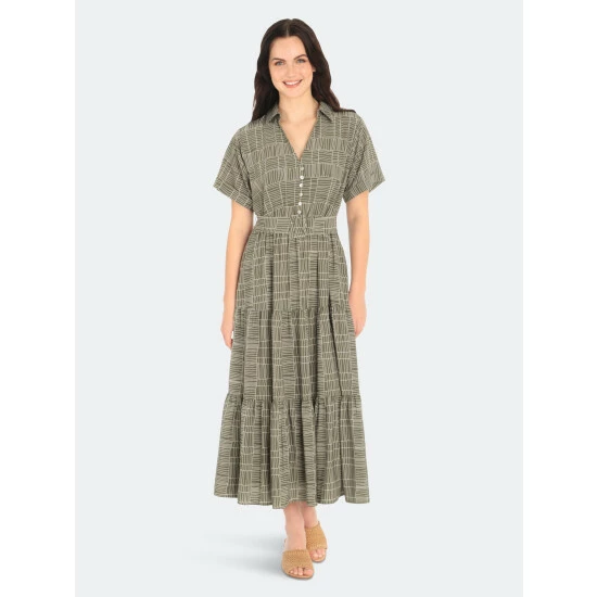 Our claire midi dress in olive green and ivory with its short sleeve, v-neck button-front silhouette, and pockets, make this dress a great addition to your workwear wardrobe.
