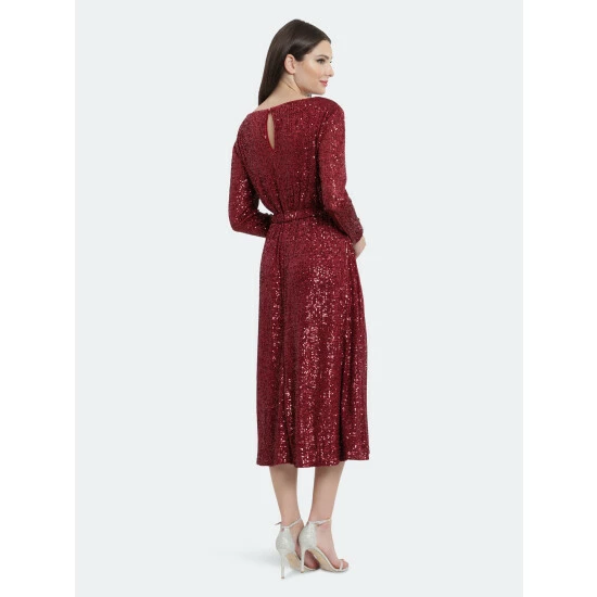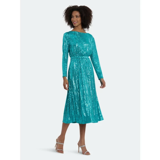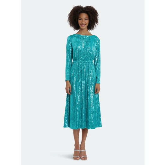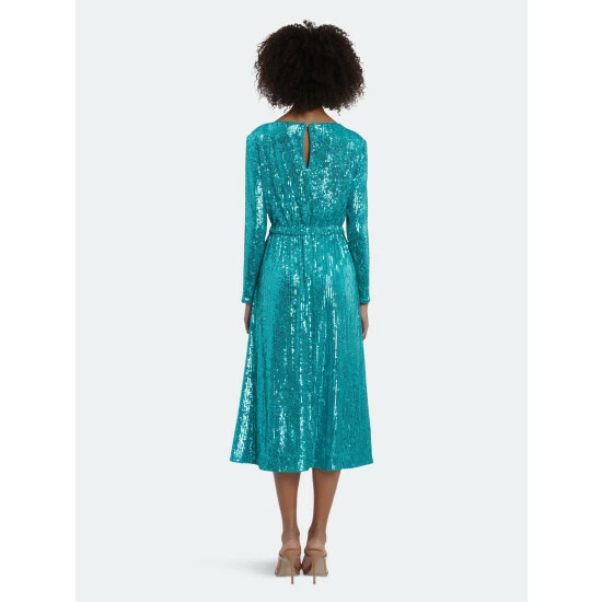 Darcie is the dreamiest midi dress of the season in a shimmery sequin fabric. We adore her boat neck and elastic waist!