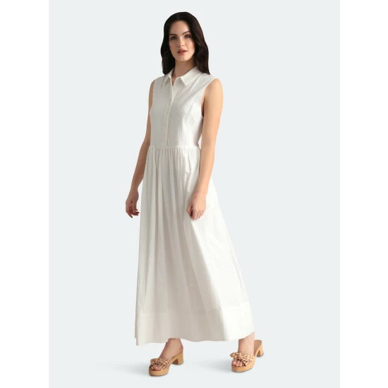 Make the Kinsley maxi with its sleeveless silhouette, button-front shirt collar in a white clip dot fabric, your next warm-weather staple.
