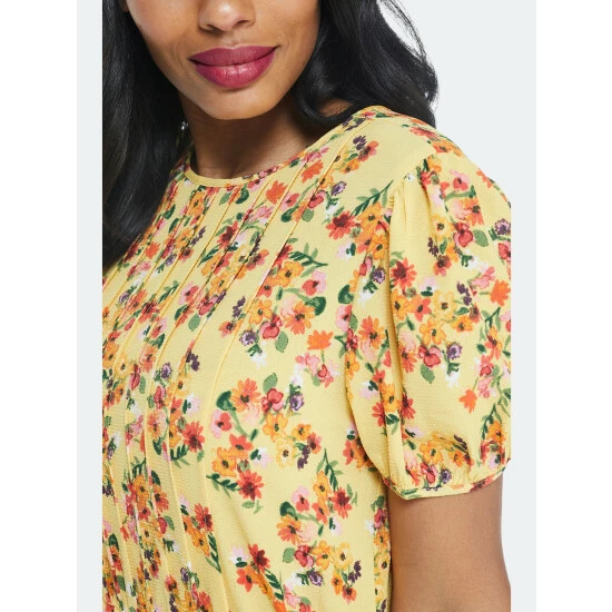 Introducing the camara dress. This springtime design features a chic floral pattern on a bold, yellow bubble crepe. Its puff sleeves and pleated details along the bust take a nod toward vintage inspo.