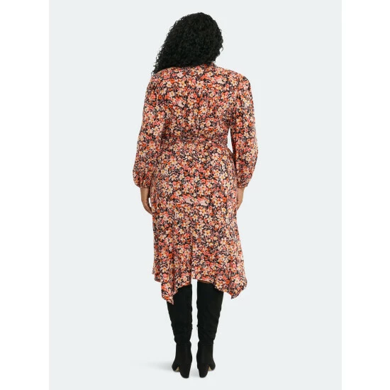 This v-neck midi is faira. We love her hanky hem and waist tie!