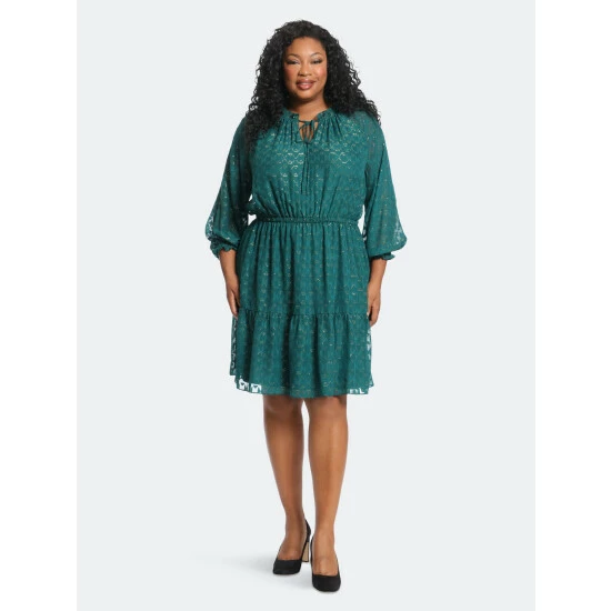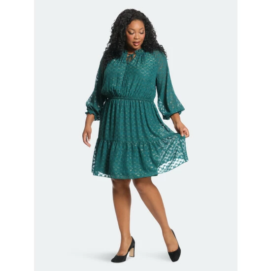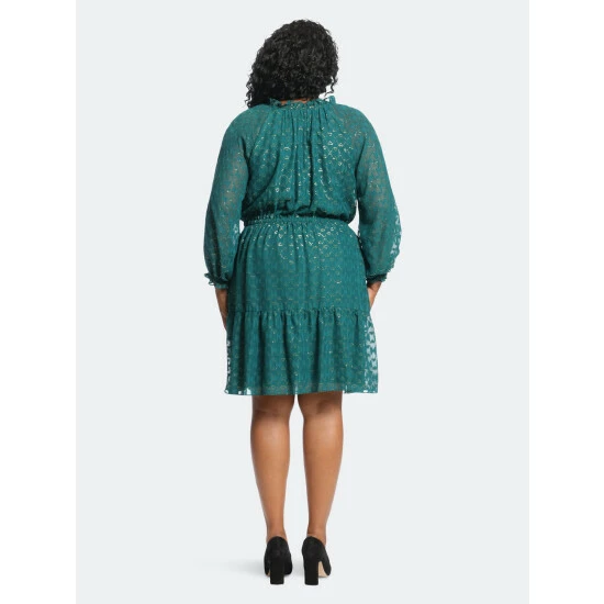This is leah. She’s made of a novelty burn-out fabric that shimmers in any light. We adore her tiered skirt, tie neckline and sheer sleeves!