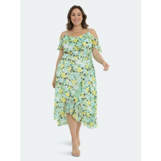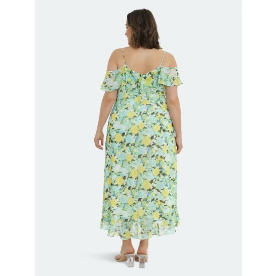 The nora ruffle cold shoulder maxi with delicate spaghetti straps in a muted floral print is perfect for your next special occasion.