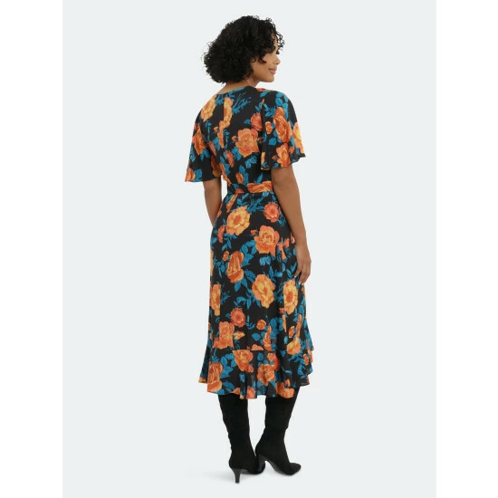 Meet Damona. We love her cascading ruffle skirt and belt on this cool teal and orange floral fabric.