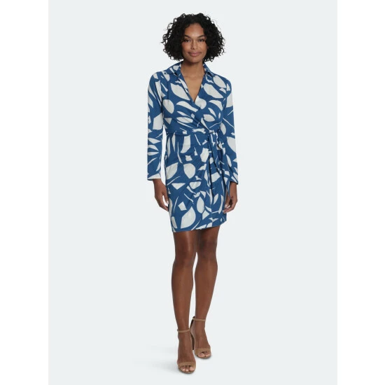 Karla is a sleek sarong dress with tons of attitude. We love her shirtdress collar and enlarged abstract print!