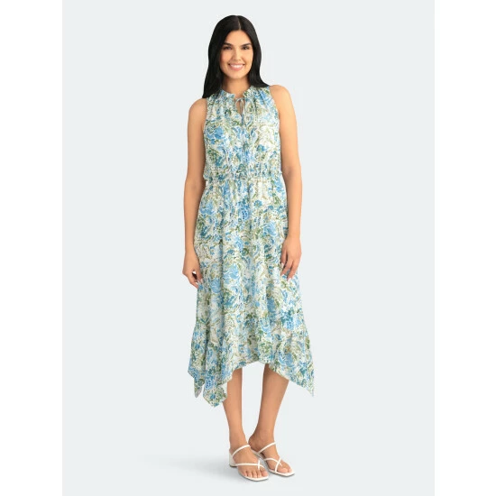 Meet our lois ruffle tie neck midi dress with hanky hem in softest watercolor floral print.