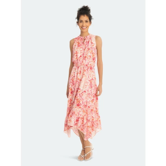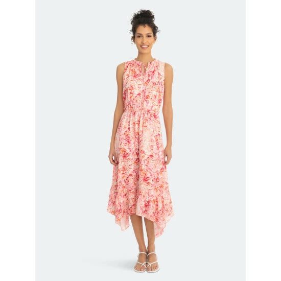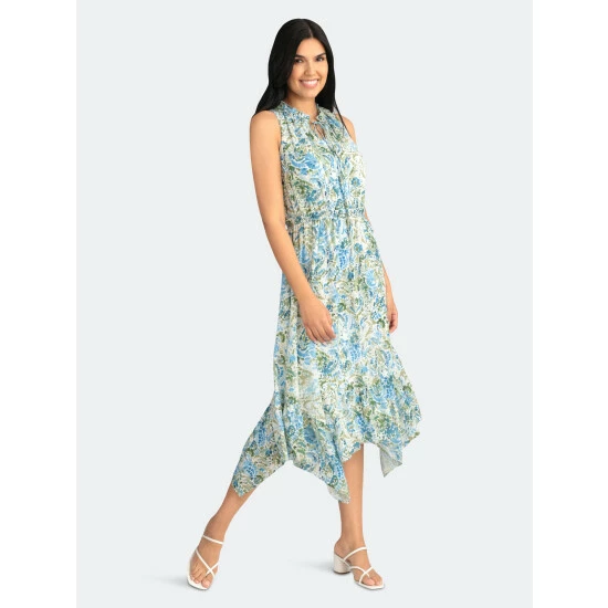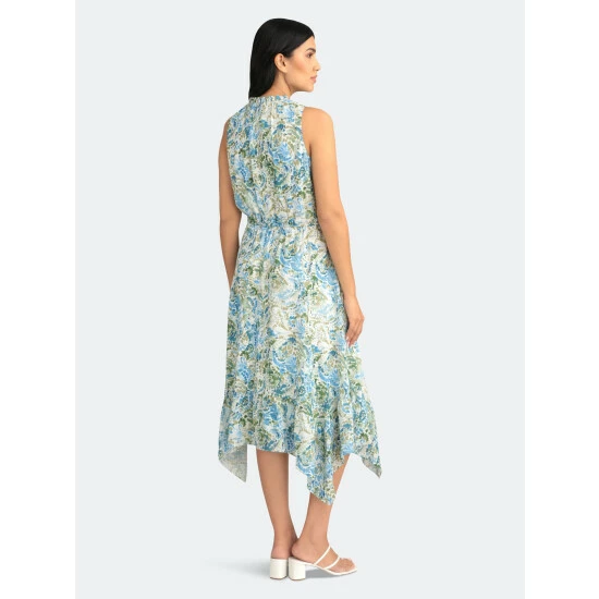 Meet our lois ruffle tie neck midi dress with hanky hem in softest watercolor floral print.