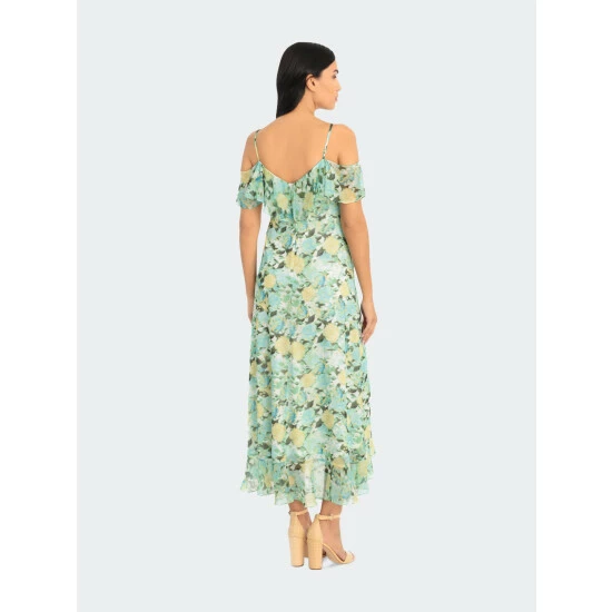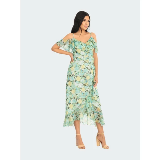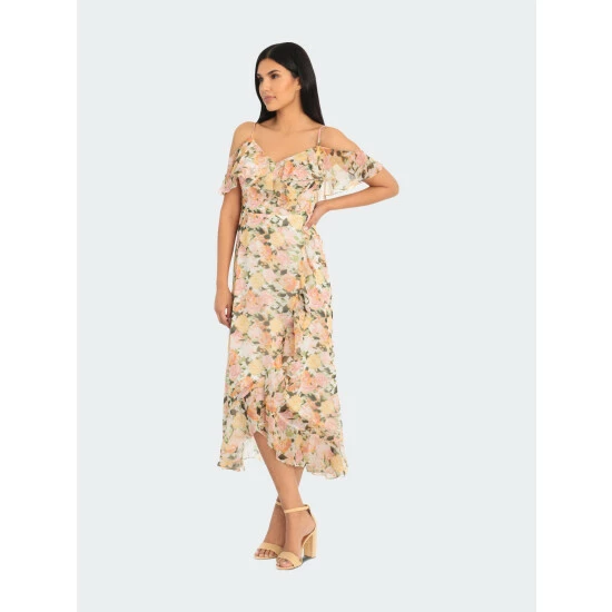 The Petite Nora ruffle cold shoulder maxi with delicate spaghetti straps in a muted floral print is perfect for your next special occasion.