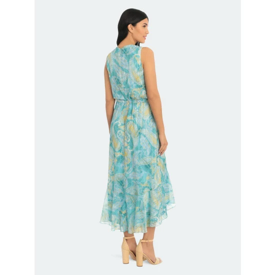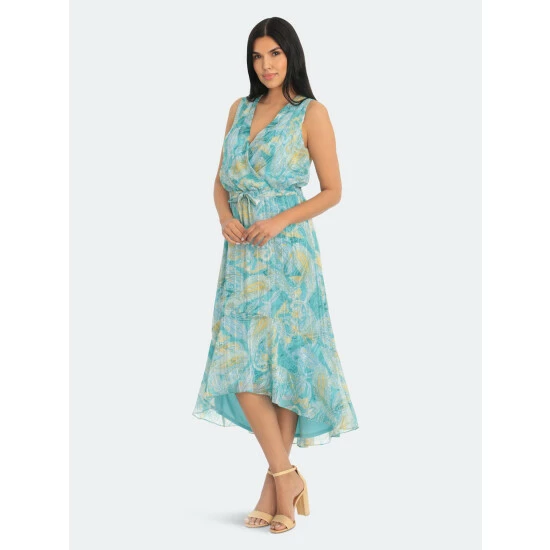 – Sleeveless- Flirty high-low hem- Cinched waist with adustable tie- Crossbody v-neck