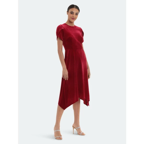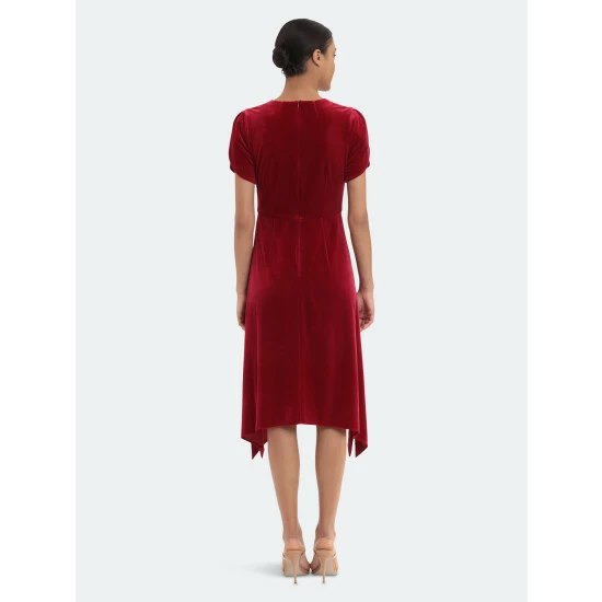 This hanky hem dress is Marti. We love her romatic tulip sleeve design and stretch velvet fabric!