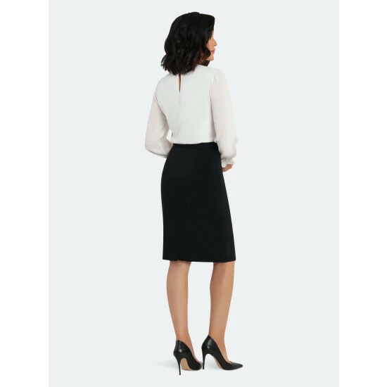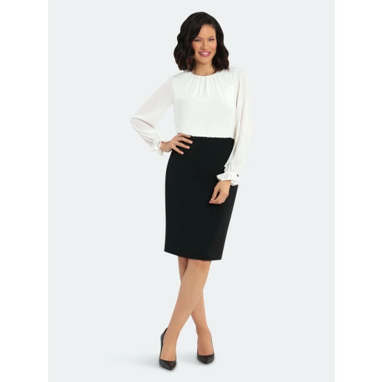Black, white, and chic all over. Our two-toned Nayda dress features a blouson top, fitted midi skirt, and sleek long sleeves. Ready to make a statement.