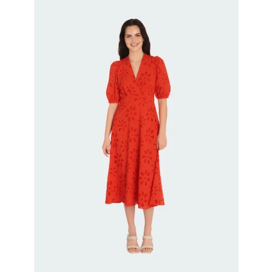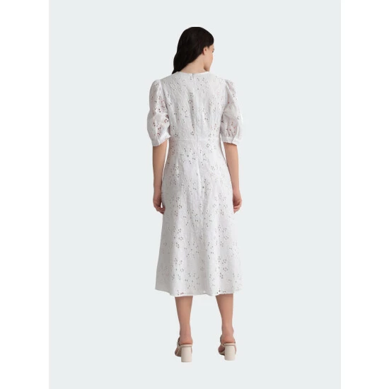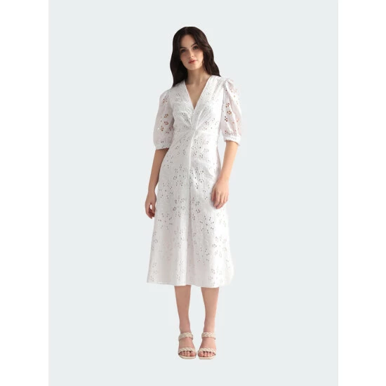 The Nia midi with its elbow-length puff sleeve and v-neck fit and flare silhouette in a fun daisy pattern eyelet in summer white is a classic look you’ll enjoy all season long.