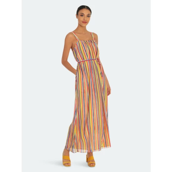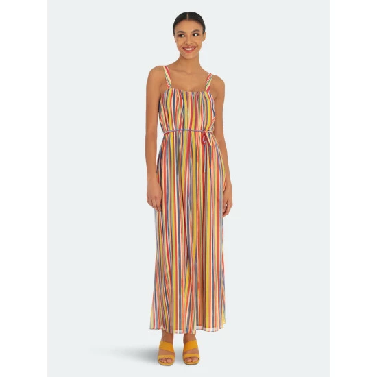 Our Siena maxi in this fun summer multi-stripe print is fully lined with pockets making it a warm weather-ready must-have.