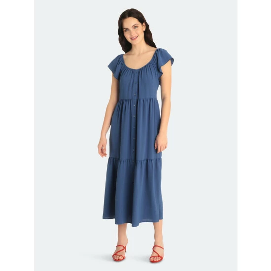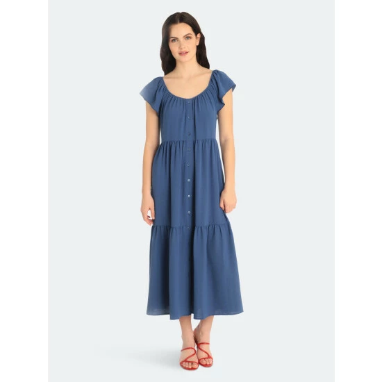 We guarantee our Sylar u-neck, short sleeve, button front shirt dress in french blue will be your favorite warm-weather staple this season.